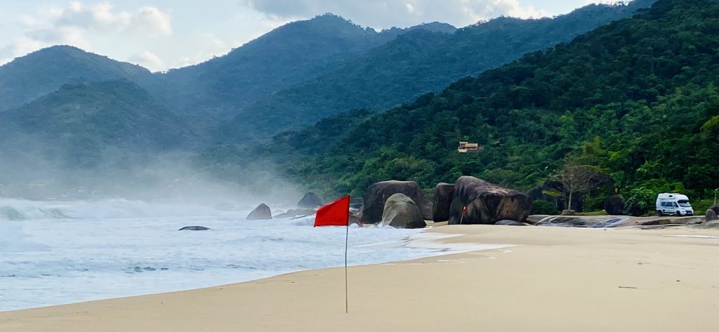 Unseren ersten Zwischenstop erreichten wir nach 150 Kilometern, den Küstenort Mangaratiba, von wo aus die Fähren zur Ilha Grande abfahren. Nachdem wir den Sonntag dort am Strand verbracht und abends den brasilianischen Barden in den Kneipen am Strand beim Trällern zugehört haben, wollten wir am späteren Abend dann auch zu Bett, weil die Fähre am kommenden Morgen bereits früh losfuhr. Wir ignorierten bei dieser Idee jedoch, daß wir an einem Wochenende direkt am Strand und der Ausgehmeile der Locals standen. Konsequenz? Kurzer Schlaf! Brasilianer sind nämlich ausgesprochen ausdauernde Karaoke-Sänger und zudem Meister des Beschallens kompletter Ortschaften mit Monsterbässen. Gut – wir hätten auch wegfahren können … das wäre dann aber doch zu einfach gewesen 😜.
