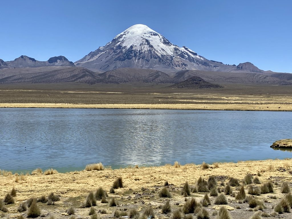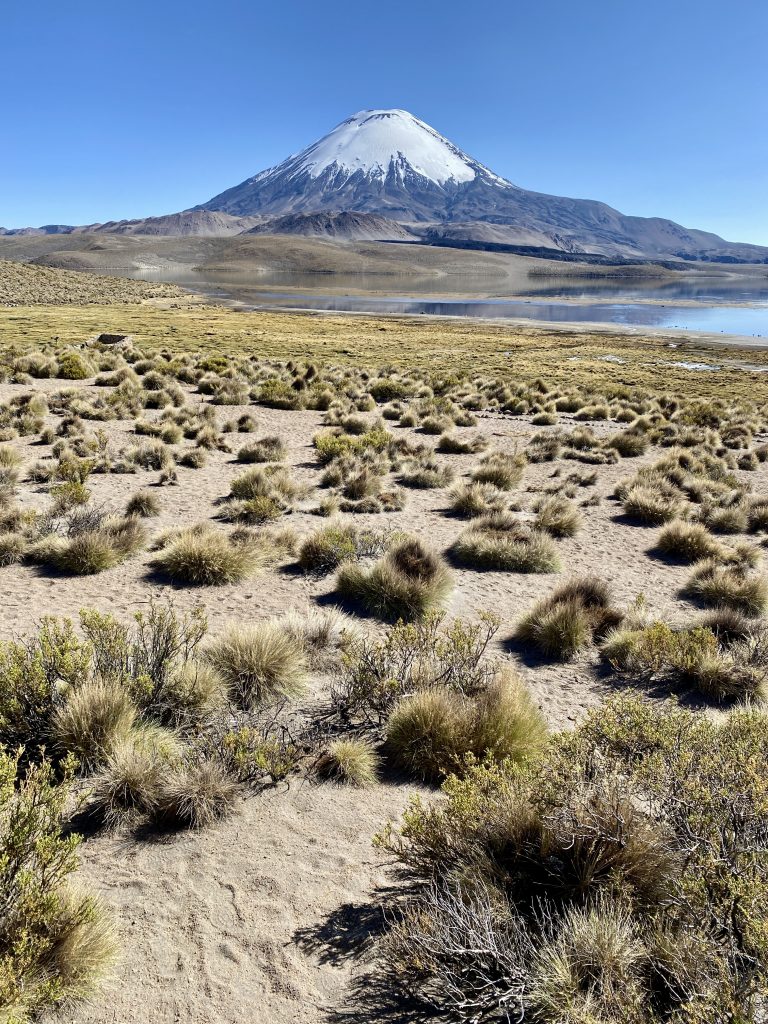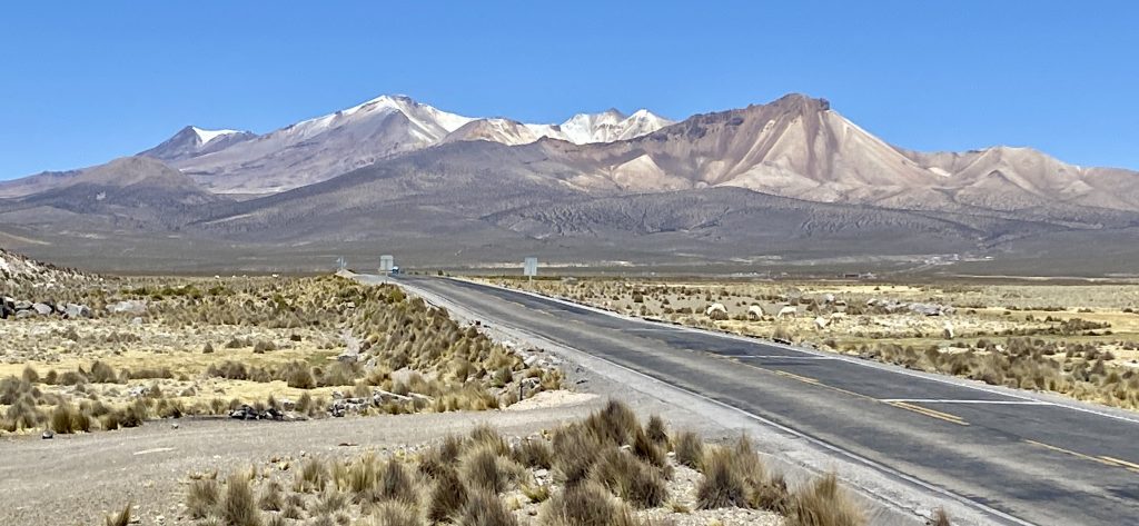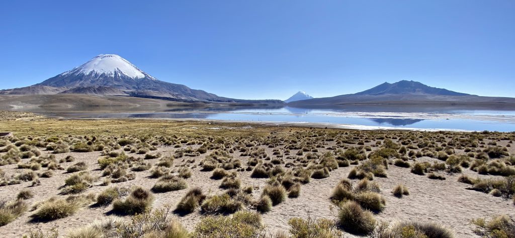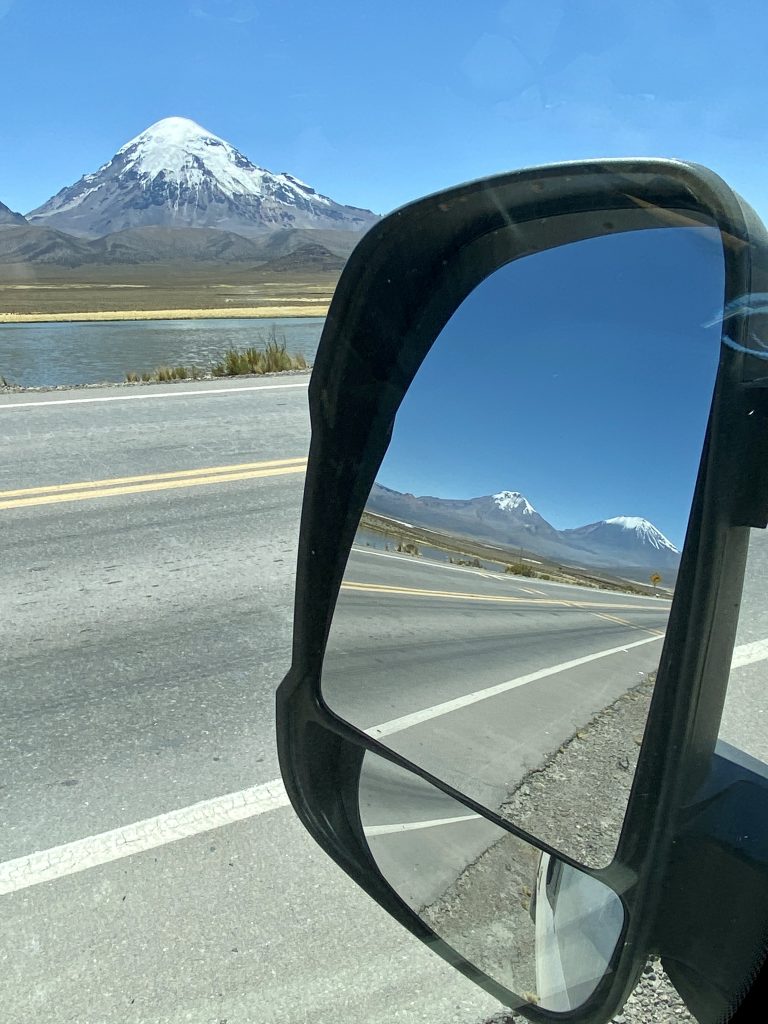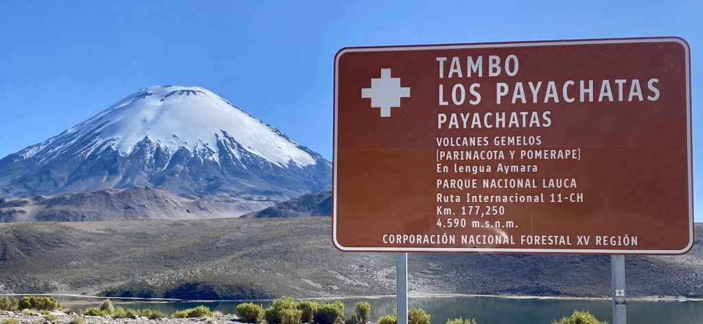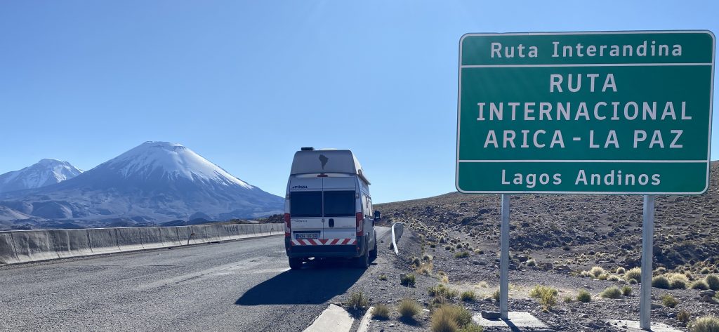 Zunächst ging es für uns am vergangenen Wochenende jedoch von Arica an der Pazifikküste wieder ostwärts in das Altiplano der Hochanden und über Putre, wo wir zwei Tage zur Höhenakklimatisierung verbrachten, zur bolivianischen Grenze auf 4.600 Meter Höhe. Dies- und jenseits der Grenze liegen zwei wunderschöne Nationalparks vulkanischen Ursprungs – der Parque Nacional Lauca auf chilenischer und der Parque Nacional Sajama auf bolivianischer Seite. Beide lagen glücklicherweise direkt auf unserem Weg, der „Ruta Internacional Interandina Arica – La Paz“, so daß wir immer wieder mit Miradore beglückt wurden, die spektakuläre Ausblicke auf die grandiose Nationalparksszenerie freigaben.
