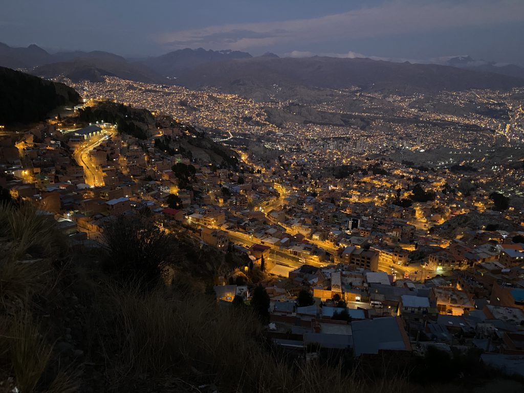 Sei‘s drum – wir errichteten kurzerhand und aufgrund der fortgeschrittenen Tageszeit und einsetzenden Dämmerung unser Nachtlager an einem Mirador an oben genannter Abrisskante und hatten als Entlohnung einen spektakulären abendlichen Blick auf das Lichtermeer des 500 Meter tiefer liegenden La Paz.