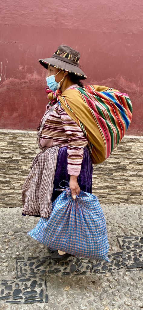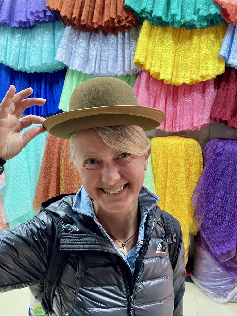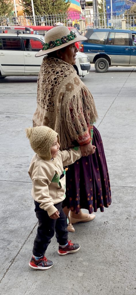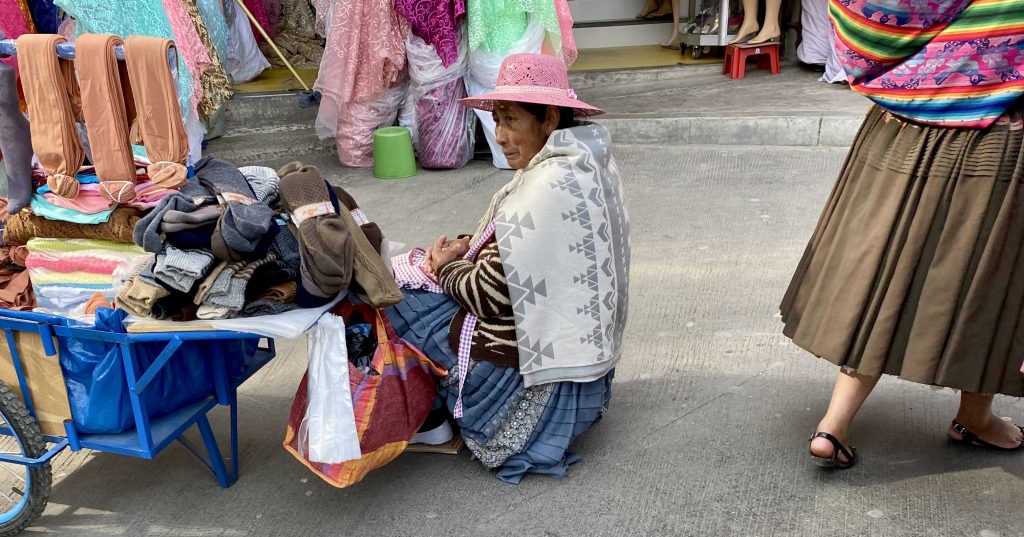 Cholita ist die Bezeichnung für Aymara und Quechua Frauen in traditioneller Kleidung. Überall in La Paz sieht man die Damen in ihren langen, farbigen und mehrlagigen Röcken, einem bunten Tuch oder Tragetuch um die Schultern, zwei geflochtenen Zöpfen und einem kleinen meist schwarzen Hut auf dem Kopf. Cholita ist dabei die Verkleinerungsform der sogenannten Cholos und Cholas. Da dieser Begriff jedoch von den Spaniern als abwertend für die indigene Bevölkerung verwendet wurde, wird die Bezeichnung Chola noch heute als sehr unhöflich empfunden. Gegen die Verkleinerungsform ist jedoch nichts einzuwenden 😉.