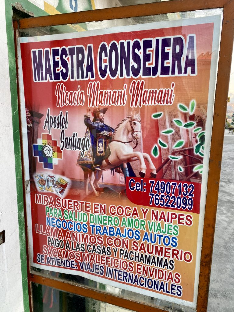 Durch die hohe Quote indigener Bevölkerung sind in La Paz und El Alto skurrile Sitten und Bräuche zu entdecken … zum Beispiel auf dem Mercado de Brujas, dem Hexenmarkt, auf dem es alles zu erwerben gibt, was zum Praktizieren des uralten Glaubens der Aymara benötigt wird … inkl. Lama- und Ferkelföten. Auf der Straße der Schamanen kann mit den zuvor erworbenen Zutaten vom Hexenmarkt dann die spirituelle Sitzung vollzogen werden, um durch Opfergaben und spirituellen Zeremonien die individuellen Ziele bestmöglich zu unterstützen. Die sogenannten Yatiri sind die Schamanen und Heiler des Aymara-Volkes. Sie lesen aus Kokablättern und dienen der Gemeinde durch weiße Magie. Welches Problem auch immer existiert – gesundheitliche Probleme, Konflikte in der Familie oder mit dem Partner – Yatiris können sie mit Hilfe von Ritualen, Naturmedizin und Zaubersprüchen angeblich lösen.