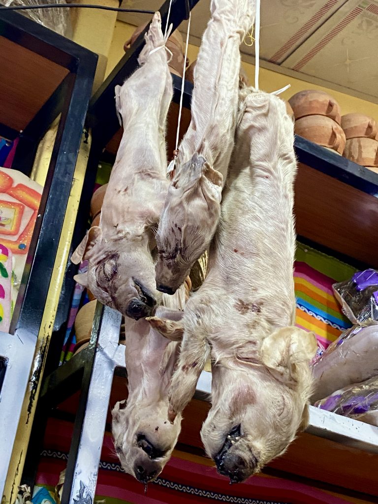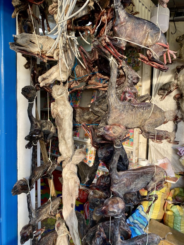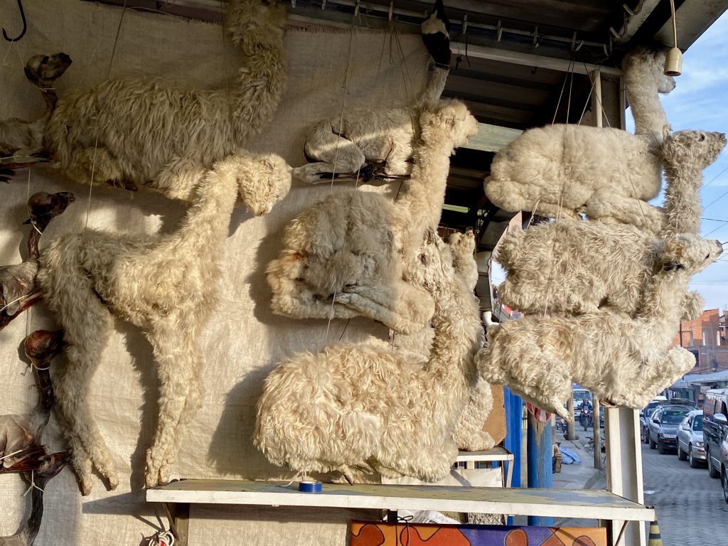 Die getrockneten Lamababys und Lamaföten hingegen sind Opfergaben für Pachamama. Je größer und weißer ein Lama ist, um so teurer ist es. Als Glücksbringer werden die toten Tiere im Fundament neuer Häuser eingegraben um damit den Bewohnern ein glückliches Leben zu sichern.