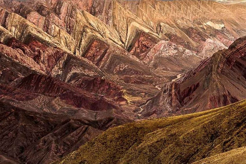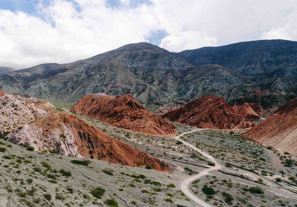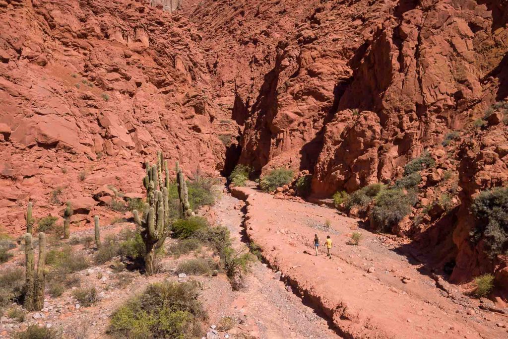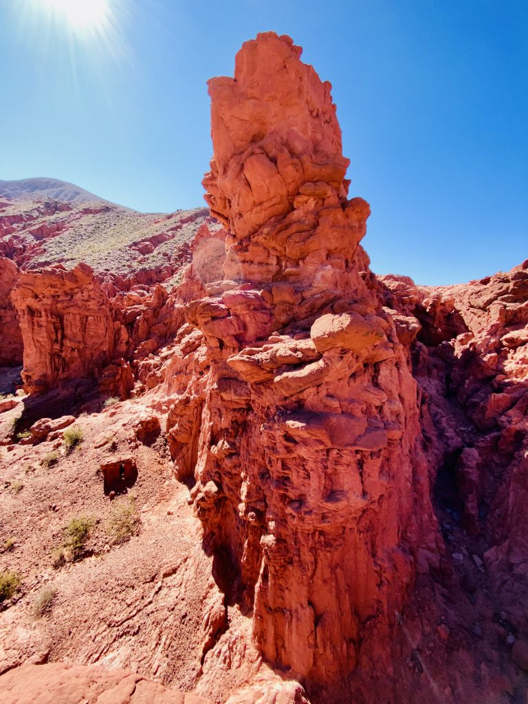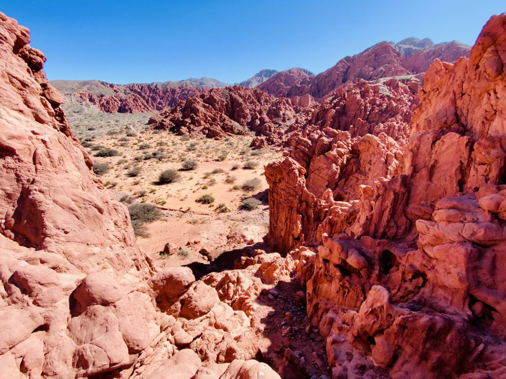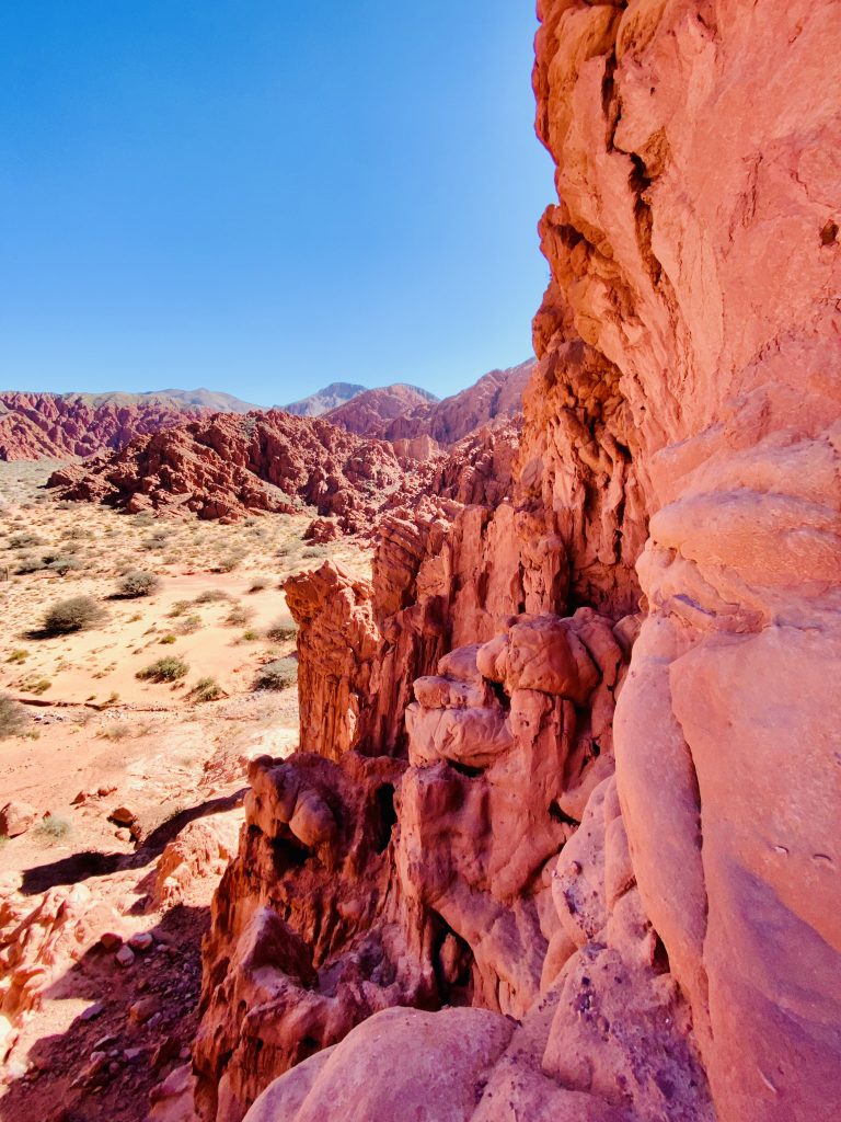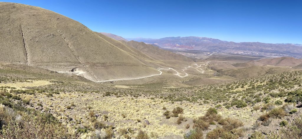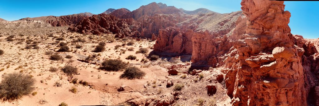 Die Quebrada erstreckt sich von San Salvador de Jujuy bis nach Bolivien. Sie ist eine abweisende und zugleich lebendige Landschaft, ein trockener und dabei von Wasserläufen durchzogener Canyon vor dem Hintergrund von Berghängen, deren Sedimentschichten zu spektakulären Formationen mit bogenförmigen Konturen gefaltet wurden und ein breites Spektrum von Farben und Pastelltönen in sanften Wellenlinien enthüllen. Die Farbpalette des Tales wechselt beständig zwischen cremefarbenen Weißtönen und leuchtenden, tiefen Rottönen. Die Felsformationen erinnerten uns an manchen Stellen an die gezackten Zähne von Haifischen oder an das knorrige Rückgrat urweltlicher Ungeheuer 😜.