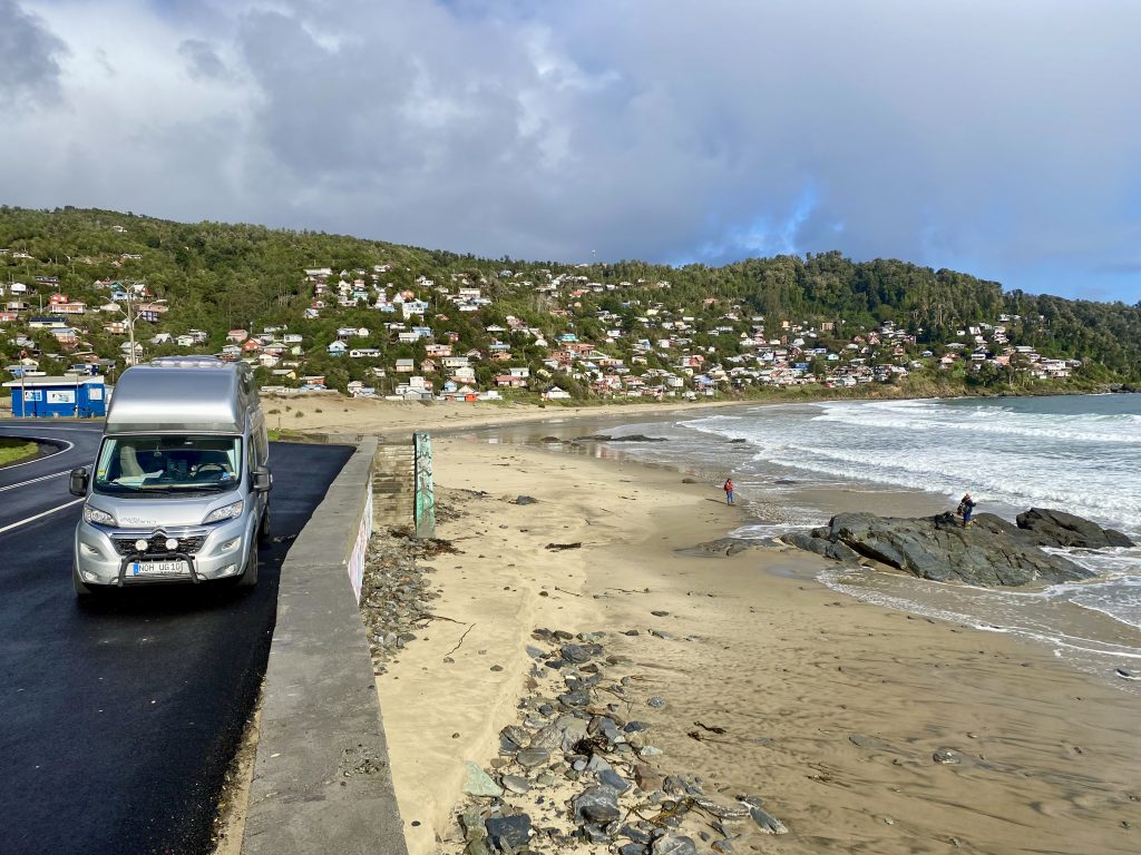 Rund 700 Kilometer davon – also ein Drittel – haben wir bereits seit Chiloé hinter uns gebracht. Wir verbinden die Fahrt immer mal wieder mit Abstechern nach Westen an die Pazifikküste, um mal mehr, mal weniger lange Abschnitte an der Küstenstrasse Richtung Norden zu fahren … zumindest dort, wo möglich …
