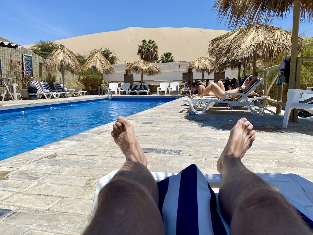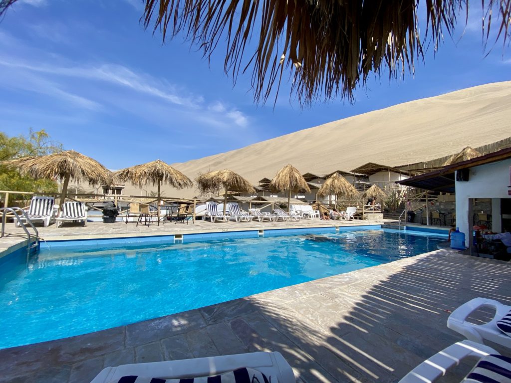 Sicher, der gesamte Ort ist auf Tourismus ausgelegt – was uns in dem Fall aber nicht gestört hat. Warum? Weil wir mit unserem Chop-Chop direkt im umzäunten Bereich der EcoLodge Huacachina standen und dort mit Pool, Pool-Bar, Restaurant und sonstiger Infrastruktur alles hatten, was wir brauchten und vor dem allabendlichen Trubel vor dem Zaun „geschützt“ waren.