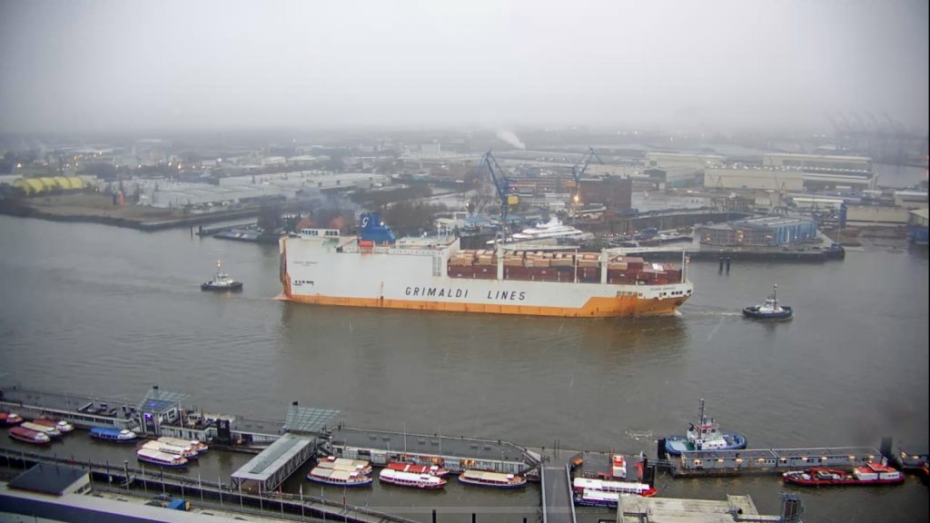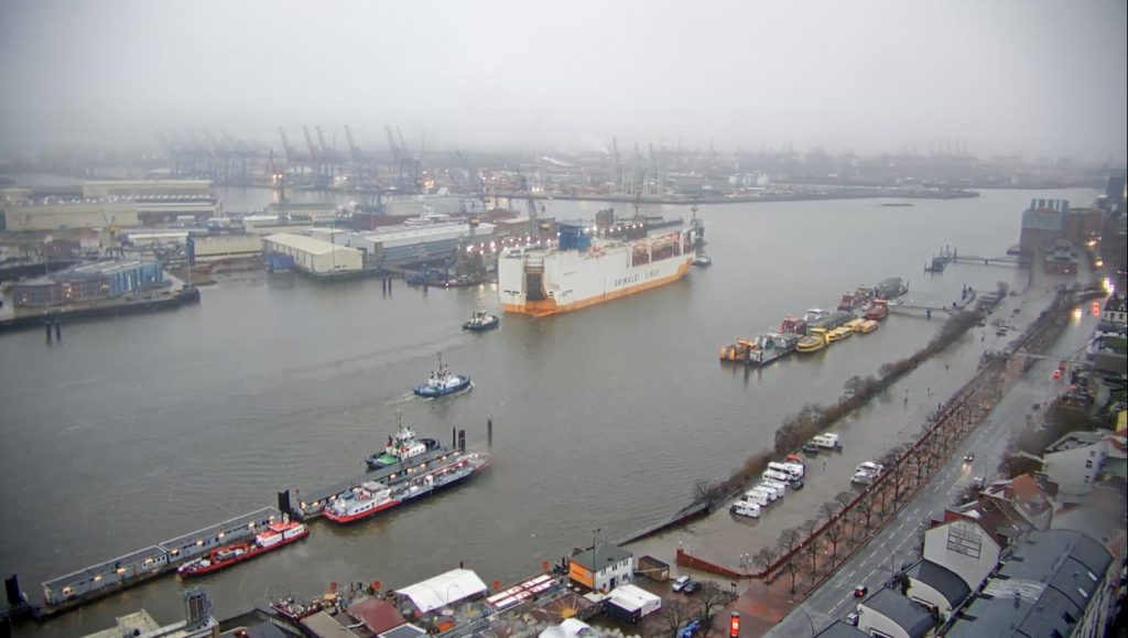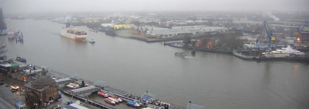 Zurück zum Frühstück! Ich wollte gerade meine Frühstücksei köpfen, dann plötzlich … zwei Schlepper auf der Schiffs-Tracking-App. Wenige Minuten später bewegt sich die Grande Amburgo vom Anleger weg. 1 Knoten, 2 Knoten, 3 Knoten … mit rund 4 Knoten Geschwindigkeit ziehen die Schlepper das große Schiff aus den Hafenbereich in die offene Elbe. Kurz vor der Elbphilharmonie kam mir der Geistesblitz, nach Webcams im Hamburger Hafen zu googeln. Volltreffer!