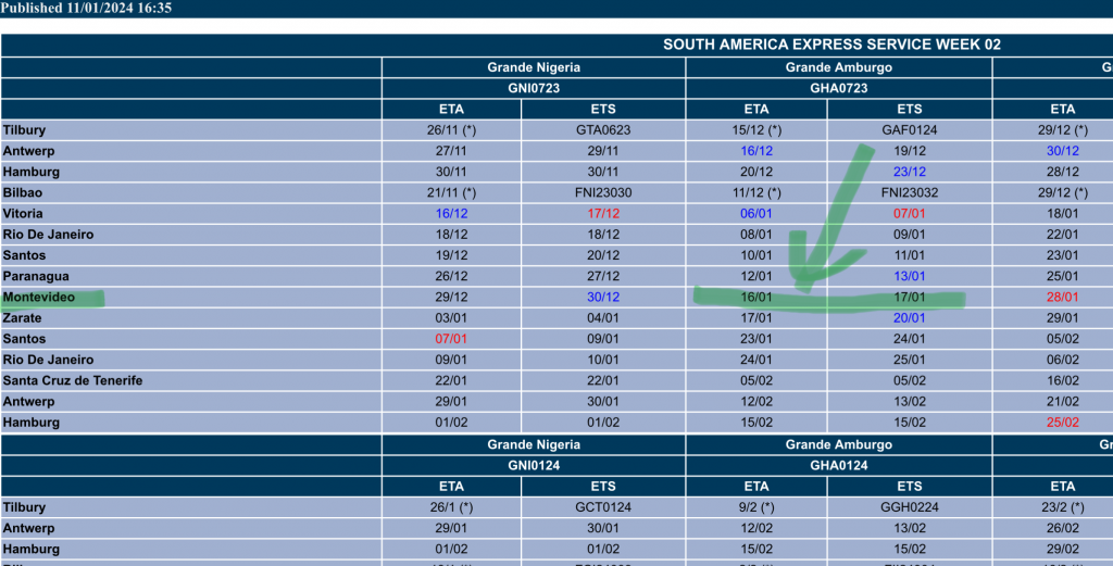 Ich hatte es bereits im letzten Beitrag angedeutet – wir hängen weiter in der Warteschleife und warten auf unseren Chop-Chop. Jetzt haben wir es auch im Online-Auskunftssystem der Grimaldi Lines schwarz auf weiß – ETA (Estimated Time of Arrival – geschätzte Ankunftszeit) für Montevideo ist jetzt schon der 16.1. 🙁.