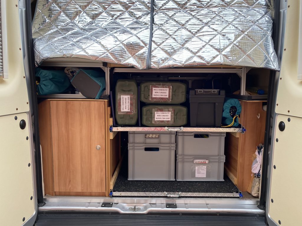 - Einbau von zwei ĂĽbereinander liegenden ausziehbaren Schwerlastregalen ĂĽber die gesamte Breite der Heckgarage